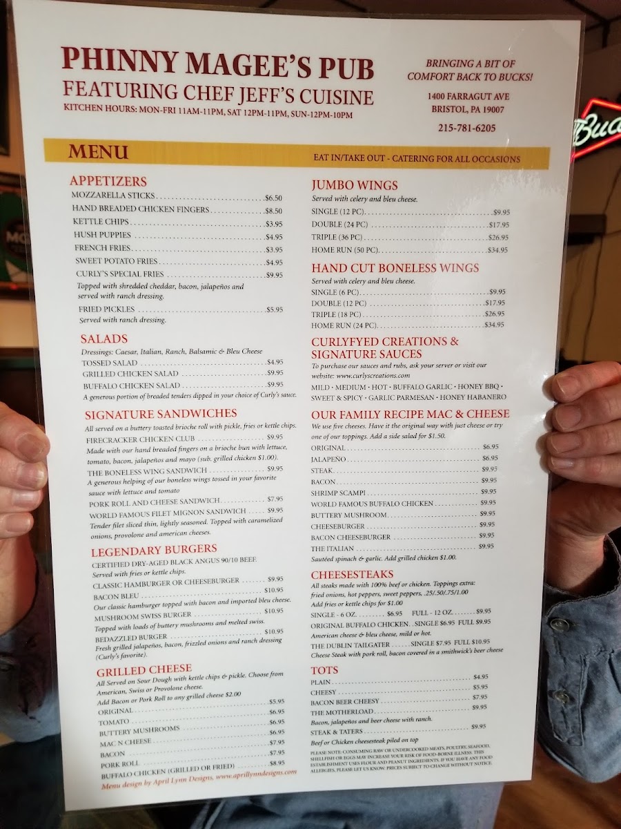 Located at 1400 Farragut Ave in Bristol, PA, Phinny Magee's Pub offers an inviting atmosphere that transcends typical bar experiences. The menu showcases hearty classics, with standout dishes like their renowned fried chicken and gigantic burgers. Diners rave about the juicy, well-cooked burgers—served on perfectly sized rolls that complement the patty without falling apart. The sweet potato fries and crispy regular fries make for delightful sides, while the boneless chicken wings are a must-try, featuring a robust buffalo sauce and creamy bleu cheese dressing.